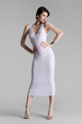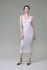 Naked back dress with a unique feel. Stretchy, ultra-soft, lightweight ribbed modal that stretches and has a sheer, shiny sheen. Streamlined, snug fit with plunging V necklines at the front and back, supported by wide straps.