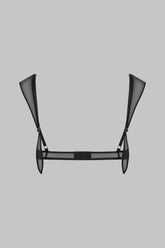 The L’AMOUREUSE openable scarf bra, in tulle of absolute transparency, features underwires for support. Wide tulle scarves can be tied as desired: around the neck to create a bust drape, or at the back for a bare-bust effect. The scarf can be slipped through the rings at the front and the additional adjusters at the back straps to style the nudity. Fine adjustable straps and a smooth, delicate back hook closure complete the piece.