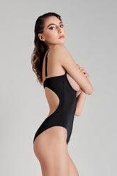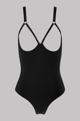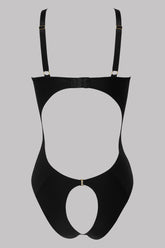 Cupless opaque microfibre bodysuit. Backless with heart-style bottom that can be opened with a gold hook on the back. Adjustable hook-and-eye fastening on the back.