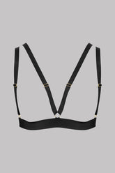 Cupless triangle bra with adjustable straps. Underarm straps can be worn at the front or at the back. Elasticated underband covered with opaque microfibre.