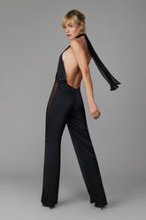 This jumpsuit features a straight cut that is fitted at the waist, and a dual-material structure that flatters the figure. It is crafted in opaque double-sided satin and tuxedo-effect chiffon strips that contrast and emphasise the legs while remaining sheer through to the hips.