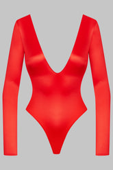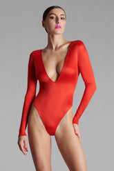 Long-sleeved high-cut thong body, combining satin softness and unique style.