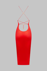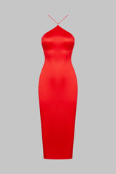 Midi length dress with a semi-American neckline combining satin softness and unique style. The open back is enhanced by lacing, the neck strap is adjustable thanks to unique adjusters and golden lipstick accessories by Maison Close.