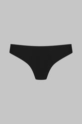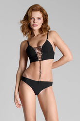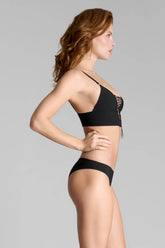 An open brief with adjustable lacing at the back, revealing the curves of the buttocks. At the front, structured opacity with two cut-outs ensures discretion. Black tone-on-tone metal eyelets and adjusters allow precise sliding of the rigid cords.