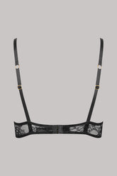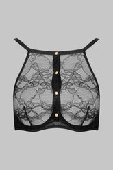 Covered breasts bra with underwire. Bust fully covered with sheer stretch lace. Can be opened at the front with magnetic gold snaps. Adjustable straps and adjustable hook-and-eye closure at the back.