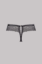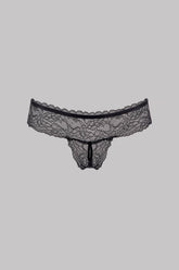 Stretch floral lace thong. Opens at the crotch with tone-on-tone buttons. Wide, flat waistband that detaches with a gold clip above the hollow of the buttocks.