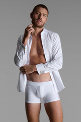 The microfiber boxer features wide sheer tulle panels on the sides. Its snug fit is slightly shorter on the thigh than a classic boxer for optimal comfort. A microfiber-covered elastic waistband provides firm support. Openable at the front with an inner lining for added comfort.