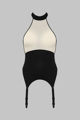 The halter-neck garter bodysuit Pure Tentation outlines the body with precision. The high neck, closed with a discreet hook, frames the silhouette and reveals a fully sheer bust, playing on the power of suggestion.