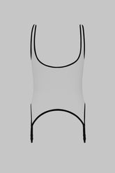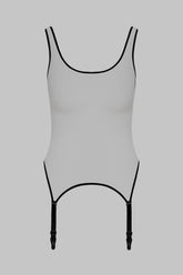 The rounded neckline and racerback trace a unique line, while the bust remains fully visible in a bold play of transparency. Adjustable, non-removable garters add structure to the look, to be worn with or without stockings depending on mood or moment.