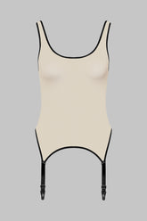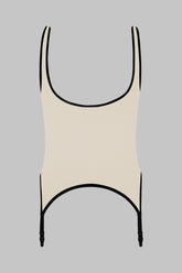 The rounded neckline and racerback trace a unique line, while the bust remains fully visible in a bold play of transparency. Adjustable, non-removable garters add structure to the look, to be worn with or without stockings depending on mood or moment.