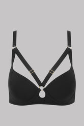 Opaque microfibre bondage bra. Harnessed with elasticated straps along the cleavage and on the back. Microfibre covered underwired push-up cups. Adjustable hook-and-eye fastening on the cutaway back.