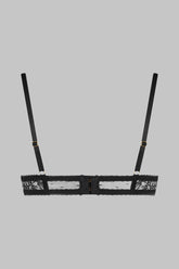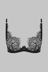 Rigid eyelash lace balconette bra with underwire. Foulard shape that creates a nice curve, adorned with a golden button. Thin elastic, adjustable straps with golden trimmings. Swiss dot mesh back with adjustable hook-and-eye fastening.