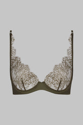 Silk and eyelash lace scarf bra. Underwired cups, rigid transparent lace foulard that hugs and shows off the neckline. Silk covered basque. Fastens at the back with a adjustable clip. Delicate adjustable straps with golden accessories.