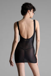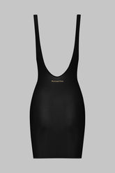 Short dress with wide straps, crafted from fine jersey with shiny and subtly transparent highlights. Fitted cut edged with ultra-flat, comfortable elastic. Its neckline, high-cut armholes, and daring backless design take us back to the 90s. The Maison Close golden logo signature is displayed at the small of the back.
