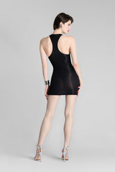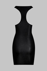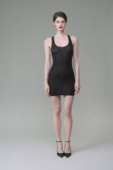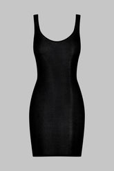 Short dress with a unique feel. Stretchy, ultra-soft, lightweight ribbed modal that stretches and has a sheer, shiny sheen. Figure-hugging, streamlined design with a scoop neckline and racer back.