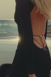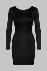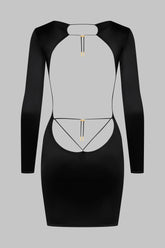 Short long-sleeved dress with a boat neckline combining satin softness and unique style. At the front, a sleek and minimalist silhouette against a back completely revealed to the hollow of the back by a delicately pleated lacing game in the neck. The lacing is adjustable thanks to unique adjusters and gold lipstick accessories by Maison Close.
