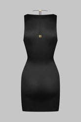 Short plunging V-neck dress combining satin softness and elegant style. A lacing around the neck, repositionable and adjustable thanks to a unique adjuster and golden lipstick accessories signed Maison Close, sublimates the neckline while allowing customization according to your desires.