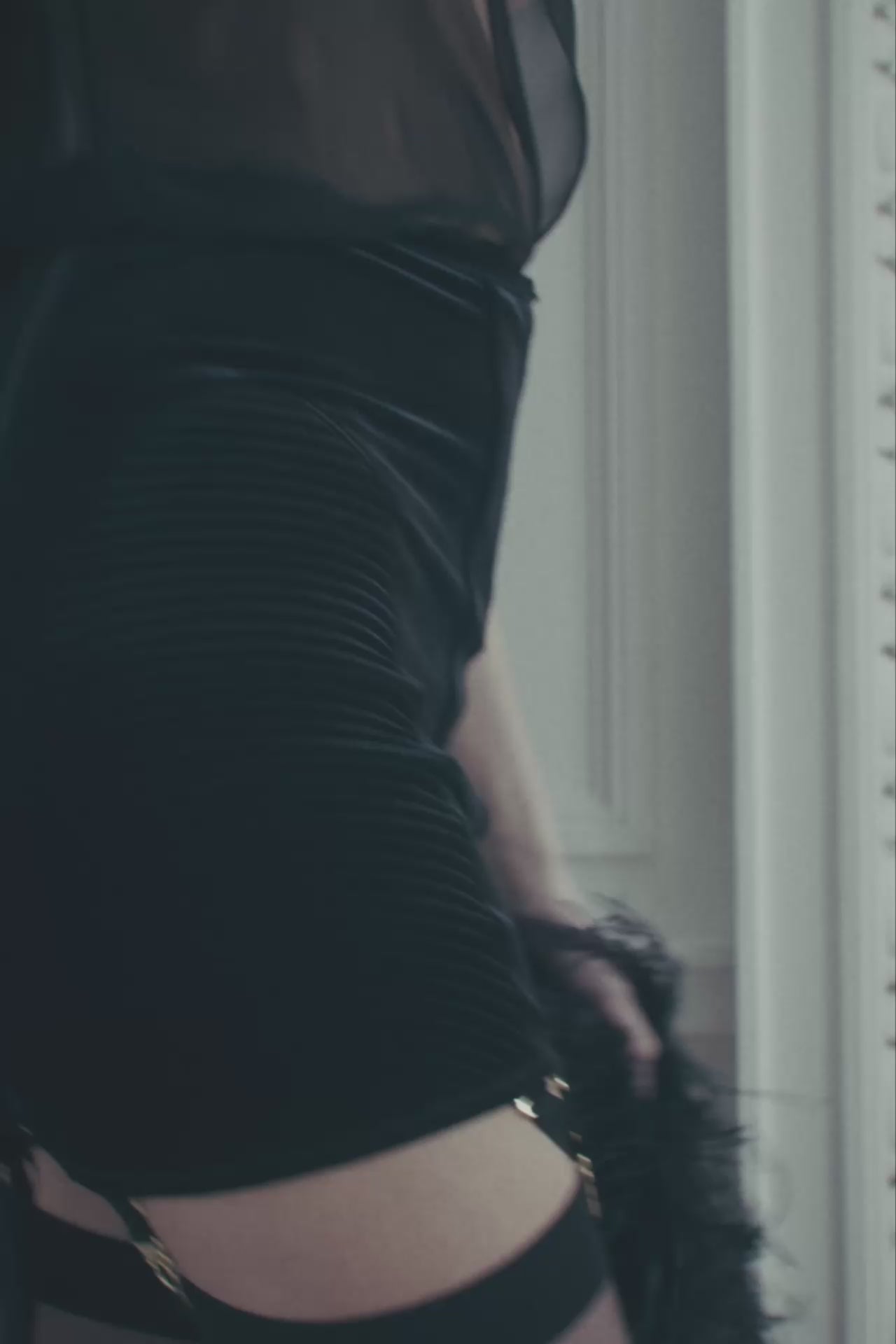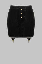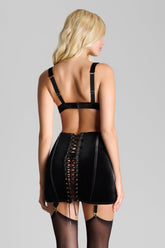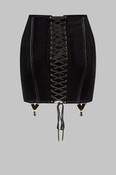 ROCOCO garter skirt in full velvet, conceived as a corsetry-inspired piece to be worn boldly on display. Its high-waisted shape is structured at the back with flexible steel boning that cinches the waist and creates a close-fitting line.