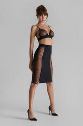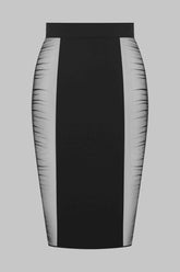 Bi-material pencil skirt. The sides have sheer tulle structured with pleated seams to define the silhouette. A wide covered elasticated waist sculpts the look. The opaque front and back panels offer discretion.