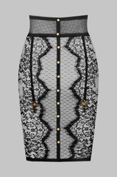Suspender skirt combining rigid eyelash lace and stretch Swiss dot mesh which sculpts the silhouette. Elasticated picot trim belt sculpts the waist. Four detachable, adjustable suspender straps embellished with golden crosses. Non-opening golden buttons emphasise the curves.
