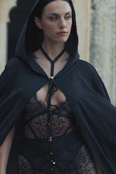 The desire to spellbind is revealed beneath the most exquisitely crafted baroque lace paired with a sophisticated Swiss dot motif. The spiritual is bound to the body through the form of a strap embellished with a golden cross.