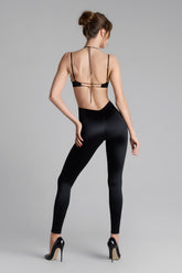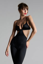 Catsuit with bralette neckline, combining satin softness and unique style. The seamless cups are elegantly structured with pleating at the neckline. Repositionable and adjustable thanks to a unique adjuster and gold lipstick accessories by Maison Close, the lacing around the neck enhances your décolleté while allowing you to personalise it as you wish. The flat and adjustable fine straps ensure a perfect fit. An elasticated band around the chest perfectly hugs and shapes the bust. Adjustable hook-and-eye fastening at the back.