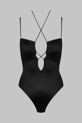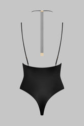 Thong body with straps, combining satin softness and elegant style. A ravishing back structured with flat and adjustable fine straps and an unmistakeable 80s-style neckline. Lacing detailing delicately pleated at the front offers adjustable, elegant openings thanks to a unique adjuster and gold lipstick accessories by Maison Close, to adjust as you wish. Adjustable hook-and-eye fastening at the crotch.