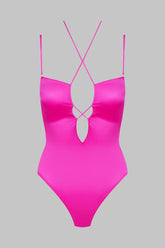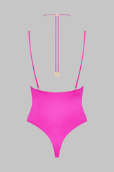 Thong body with straps, combining satin softness and elegant style. A ravishing back structured with flat and adjustable fine straps and an unmistakeable 80s-style neckline. Lacing detailing delicately pleated at the front offers adjustable, elegant openings thanks to a unique adjuster and gold lipstick accessories by Maison Close, to adjust as you wish. Adjustable hook-and-eye fastening at the crotch.