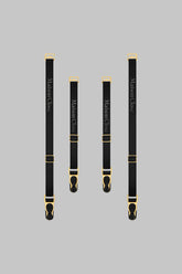 Four black detachable, adjustable Signature suspender straps with gold accents. Team with other Signature items available in various colours. An opportunity for each Muse to create their own zingy mix and match.