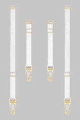 Four white detachable, adjustable Signature suspender straps with gold accents. Team with other Signature items available in various colours. An opportunity for each Muse to create their own zingy mix and match.