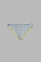 Tanga in pastel-colored chiffon, trimmed with fluorescent accents. A distinctly feminine French cut, elasticated at the waist and delicately high-cut with airy ruffles, elongates the legs and gracefully reveals the hips. No cotton lining for complete transparency.
