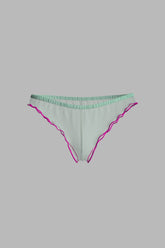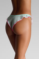 Tanga in pastel-colored chiffon, trimmed with fluorescent accents. A distinctly feminine French cut, elasticated at the waist and delicately high-cut with airy ruffles, elongates the legs and gracefully reveals the hips. No cotton lining for complete transparency.