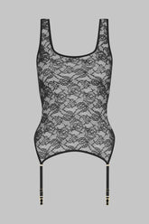 This suspender tank top is embellished with mostly recycled openwork lace. With its flat elasticated trim, its shape emphasises your curves for a unique style. Four removable, adjustable Signature straps with gold trim – interchangeable with the other Signature straps available in a range of colours. An opportunity for each Muse to create their own unique mix and match.