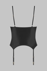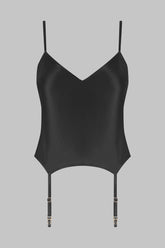 Suspender tank top in natural silk. A V neckline delicately holds the bust. Four fixed, adjustable suspender straps with gold accents. Adjustable silk straps with golden accessories. Exceptional lingerie with an impeccable fit to wear with nylon stockings.