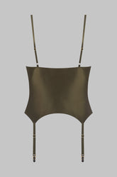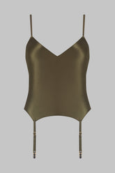 Suspender tank top in natural silk. A V neckline delicately holds the bust. Four fixed, adjustable suspender straps with gold accents. Adjustable silk straps with golden accessories. Exceptional lingerie with an impeccable fit to wear with nylon stockings.