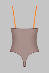 This nude colour thong body features soft mesh with a sheer iridescent appearance.