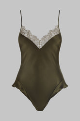 Thong body in silk and eyelash lace. Our famous ultra-feminine ""French cut"" with a hint of retro that eloquently shows-off the hips and buttocks. V neckline adorned with rigid lace delicately holds the bust. Thin adjustable silk straps with golden accessories. Non-openable crotch for extra comfort.