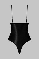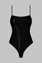 High-leg thong bodysuit with unique feel. Stretchy, ultra-soft, lightweight ribbed modal that stretches and has a sheer, shiny sheen. Snug fit with cotton lining and adjustable hook-and-eye fastenings on crotch. Non-removable, slim, adjustable straps with silver trim.