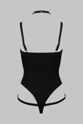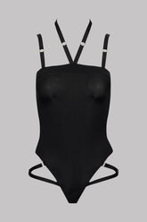 Opaque microfibre bondage thong bodysuit. High-leg design harnessed on the thighs with adjustable elasticated straps. Straight neckline with adjustable elasticated straps at the back. Heat bonded seams for a smooth, seamless look.