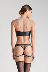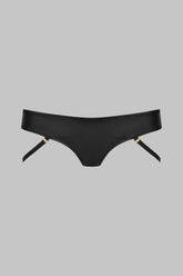 Low-cut G-string with a matte leather effect fabric on the front and transparent tulle at the back.