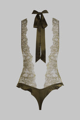 Silk and eyelash lace scarf thong body. Scoop cut adorned with a silk flounce that subtly shows off the hips and buttocks. Transparent lace that subtly reveals the bust and offers a naked back. High silk collar extended by a wide tie ribbon to employ as you wish. Non-openable crotch for extra comfort.