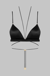 Triangle bra without underwire, combining satin softness and style. Designed to perfectly fit the shape of the breasts thanks to its seamless molded triangle cups. The totally removable and adjustable neck lacing thanks to a unique adjuster and gold lipstick accessories signed Maison Close, sublimates your cleavage while allowing customization according to your desires. The thin, flat, adjustable straps ensure a perfect fit. An elastic band around the bust hugs and shapes the bust perfectly. Adjustable hook and eye closure at the back.