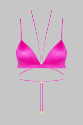 Triangle bra without underwire, combining satin softness and style. Designed to perfectly fit the shape of the breasts thanks to its seamless molded triangle cups. The totally removable and adjustable neck lacing thanks to a unique adjuster and gold lipstick accessories signed Maison Close, sublimates your cleavage while allowing customization according to your desires. The thin, flat, adjustable straps ensure a perfect fit. An elastic band around the bust hugs and shapes the bust perfectly. Adjustable hook and eye closure at the back.
