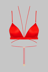 Triangle bra without underwire, combining satin softness and style. Designed to perfectly fit the shape of the breasts thanks to its seamless molded triangle cups. The totally removable and adjustable neck lacing thanks to a unique adjuster and gold lipstick accessories signed Maison Close, sublimates your cleavage while allowing customization according to your desires. The thin, flat, adjustable straps ensure a perfect fit. An elastic band around the bust hugs and shapes the bust perfectly. Adjustable hook and eye closure at the back.