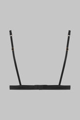 Natural silk triangle bra. Triangle cups without underwire that hold the breasts perfectly. Thin straps covered with gathered silk at the front and adjustable elastics at the back with golden accessories. Elastic band covered with gathered silk beneath the breasts. Fastens at the back with a adjustable clip.