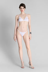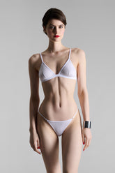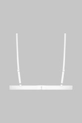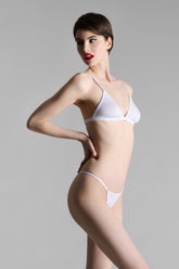 Triangle bra without underwiring and a unique feel. Stretchy, ultra-soft, lightweight ribbed modal that stretches and has a sheer, shiny sheen. Non-removable modal-covered spaghetti straps with adjustable silver trim. Adjustable hook-and-eye fastening on the back.
