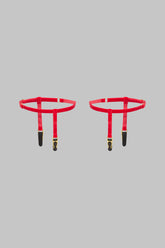 The VELVET SET red garters enhance the legs with refined elegance. Crafted from soft-touch velvet, they are fully adjustable to suit all body types. Featuring golden suspenders, they can be gracefully paired with stockings. Wear them alone or styled with the matching panty and harness from the collection. An accessory that bridges the body and the detail.