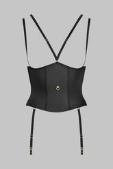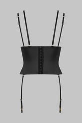 Matte leather effect waist cincher with suspenders. Fitted cut to enhance the waist. Removable suspenders, straps and choker harness are removable and can be adjusted with golden ornamental trims. Flexible vertical whalebones for improved structure and support. Adjustable hook-and-eye fastening on the back. The collection's signature golden "feti-chic" ring embellishes the front, inviting you to attach it