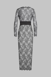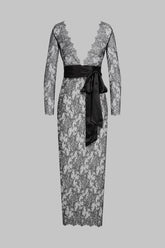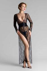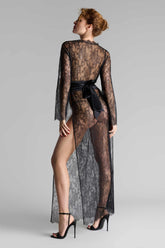 Long wrap over dress in silk and eyelash lace. Long kimono cut with slits on both sides in ultra-feminine rigid lace. V neckline, wrap front closure with adjustable press studs. The allover delicate and transparent lace of the dress highlights the figure. Wide silk ribbon belt to tie at the waist as you wish.