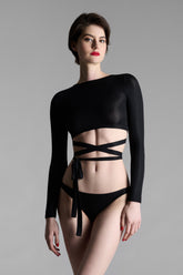 Long-sleeved wrap top with a unique feel. Stretchy, ultra-soft, lightweight ribbed modal that stretches and has a sheer, shiny sheen. Reversible plunging wrapover neckline that can be worn back or front. Play with the lacing to fasten and adjust the wrap to suit you.